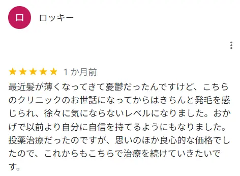 しかし、薄毛が改善しないためDクリニック東京で治療を受けたところ、3ヶ月でかなりの改善が見られたとのことです。