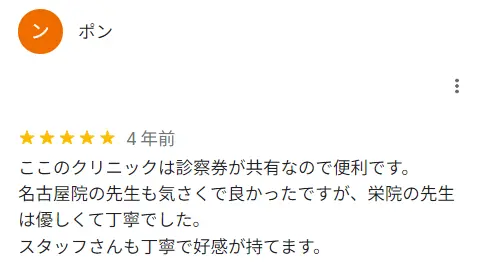 こちらの方は、イースト駅前クリニック名古屋栄院の医師が優しく丁寧な点も評価しています。