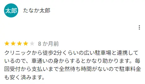 また、診察から薬の処方まで短時間で済むため、駐車料金が安く済む点も評価しています。