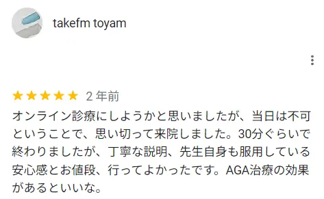 こちらの方はAGA治療でイースト駅前クリニック新橋院を受診しましたが、対面診療でなかったのが残念だったようです。