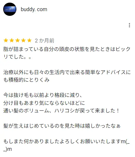 AGAスキンクリニック京都河原町院の口コミでもっとも新しいもので、分け目があまり気にならないほど髪のボリュームが増えたようです。